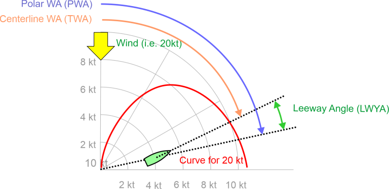 When polar curves are created by VPP programs, all TWA are measured from the wind to the boat’s course, NOT to its centerline, as these angles include the leeway. I prefer to call them polar wind angles (PWA). We should be careful when comparing them to the instrument’s TWA, as it is like comparing apples and oranges!